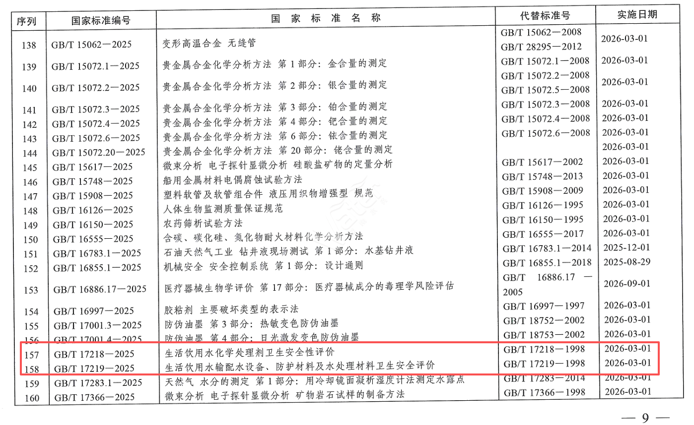 近日,国家市场监督管理总局(国家标准化管理委员会)批准发布了《生活饮用水卫生标准》(GB 5749-2022)两项重要的引用标准《生活饮用水化学处理剂卫生安全性评价》(GB/T 17218-2025 )、 《生活饮用水输配水设备、防护材料及水处理材料卫生安全评价》(GB/T 17219-2025),并将于2026年3月1日开始实施。